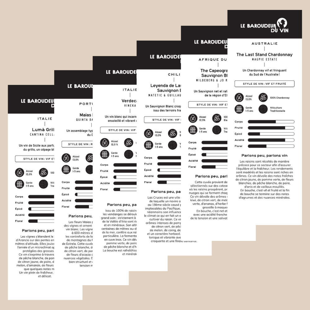 Pour certains d'entre vous le blanc c'est sacré, alors le baroudeur vous propose un sélection de vins taillés pour le plaisir ! Cinq vins blancs au profil fin, léger et fruité, au plaisir immédiat et de valeurs sûres. Partons ensemble découvrir ces vins provenant du Portugal, d'Afrique du Sud, du Chili, d'Italie ou encore d'Australie. Ils s'accorderont à merveilles avec des plats de poissons, des salades composées ou tout simplement lors de vos apéro entre amis !